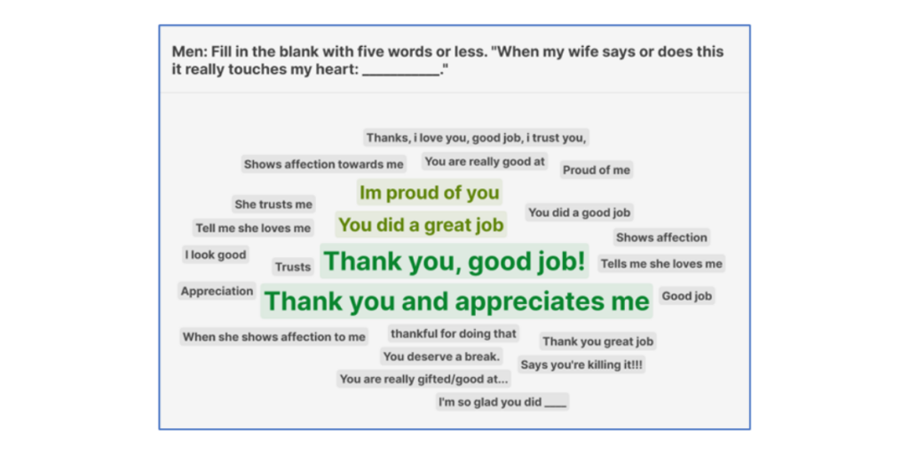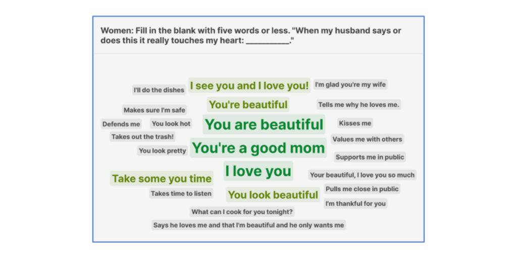 The attendees often find two things astonishing as the words appear in real-time on the screen. The first is, “Wait, you mean that matters more to you?” For a wife, it is often surprising to know that saying “I’m proud of you” and “good job” might be much more meaningful to her husband than saying “I love you.” For a husband, it is often surprising to learn that conveying, “You’re so beautiful” has such power. (Although in families with young children, that often runs neck and neck with, “What can I cook for you tonight?”)