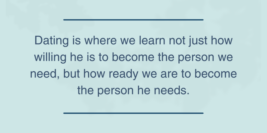 Now that we know how important respect is for a guy, many women assume we learn that in marriage—and we will, of course. But dating is where you examine the question: Is this even someone I can respect and trust? If the answer is yes, dating is where you do the hard work of putting that into practice. Dating is where we learn not just how willing he is to become the person we need, but how ready we are to become the person he needs.